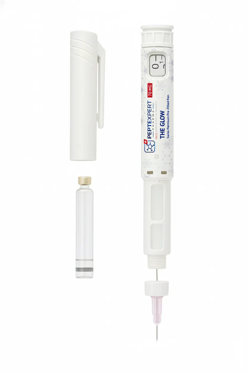 The PEPTEXPERT Pharma Guarantee When you choose THE GLOW from PEPTEXPERT Pharma, you are investing in the absolute highest standard of peptide synthesis. Embracing Swiss manufacturing philosophies, we guarantee a pristine purity level of >99%. Every batch is subjected to uncompromising quality controls, ensuring research-grade precision, stability, and safety.